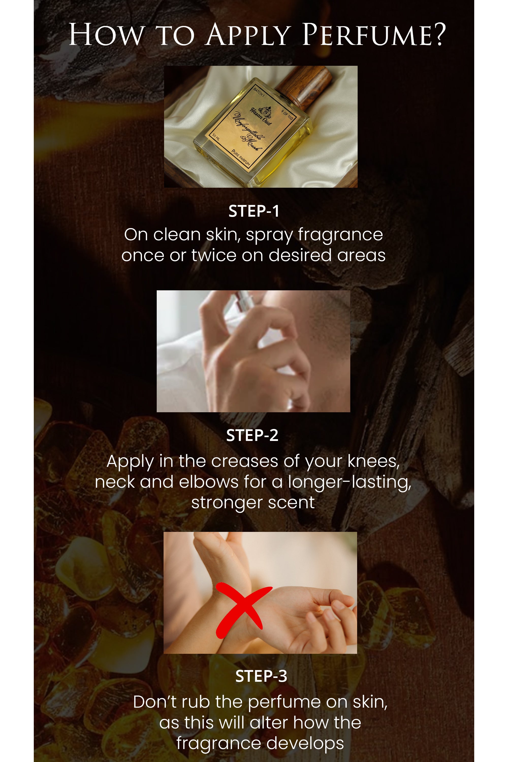Infused with the subtle embrace of incense, Unforgettable Musk takes on a captivating depth that transports you to a realm of contemplation and introspection. The aromatic tendrils of incense add a spiritual and ceremonial quality, elevating the premium fragrance into a transcendent experience.